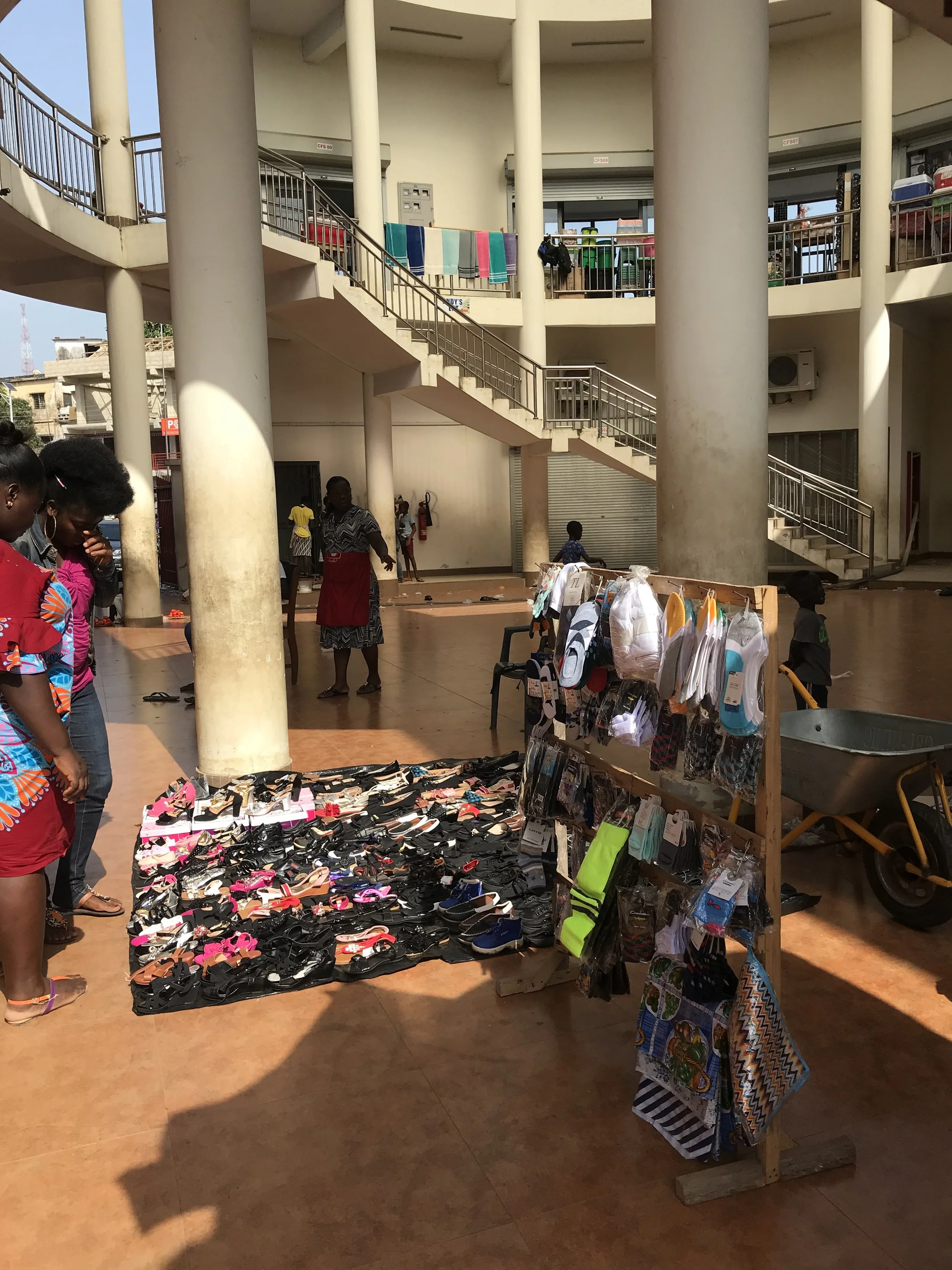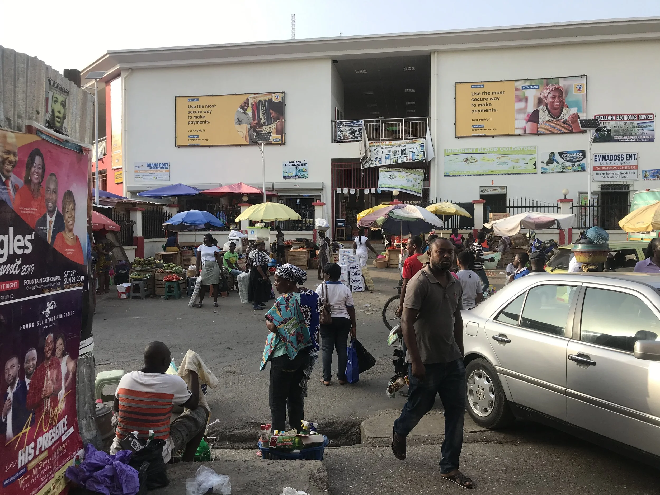 The focus of my dissertation project was modernization of Kotokuraba Market, located in the Central Region’s capital city of Cape Coast. The new Kotokuraba Market—inaugurated in November 2016—included many modern additions: enclosed glass-windowed shops, public restrooms, a drainage system, a multi-level parking garage, an office block, a public fountain, and an attractive glass atrium. Even at first glance these modern amenities, despite their practical value, stand in direct contrast to the narrow streets, open sewers, and weathered pastel facades of the colonial-style buildings that otherwise dominate the urban fabric and spatial culture of Cape Coast.